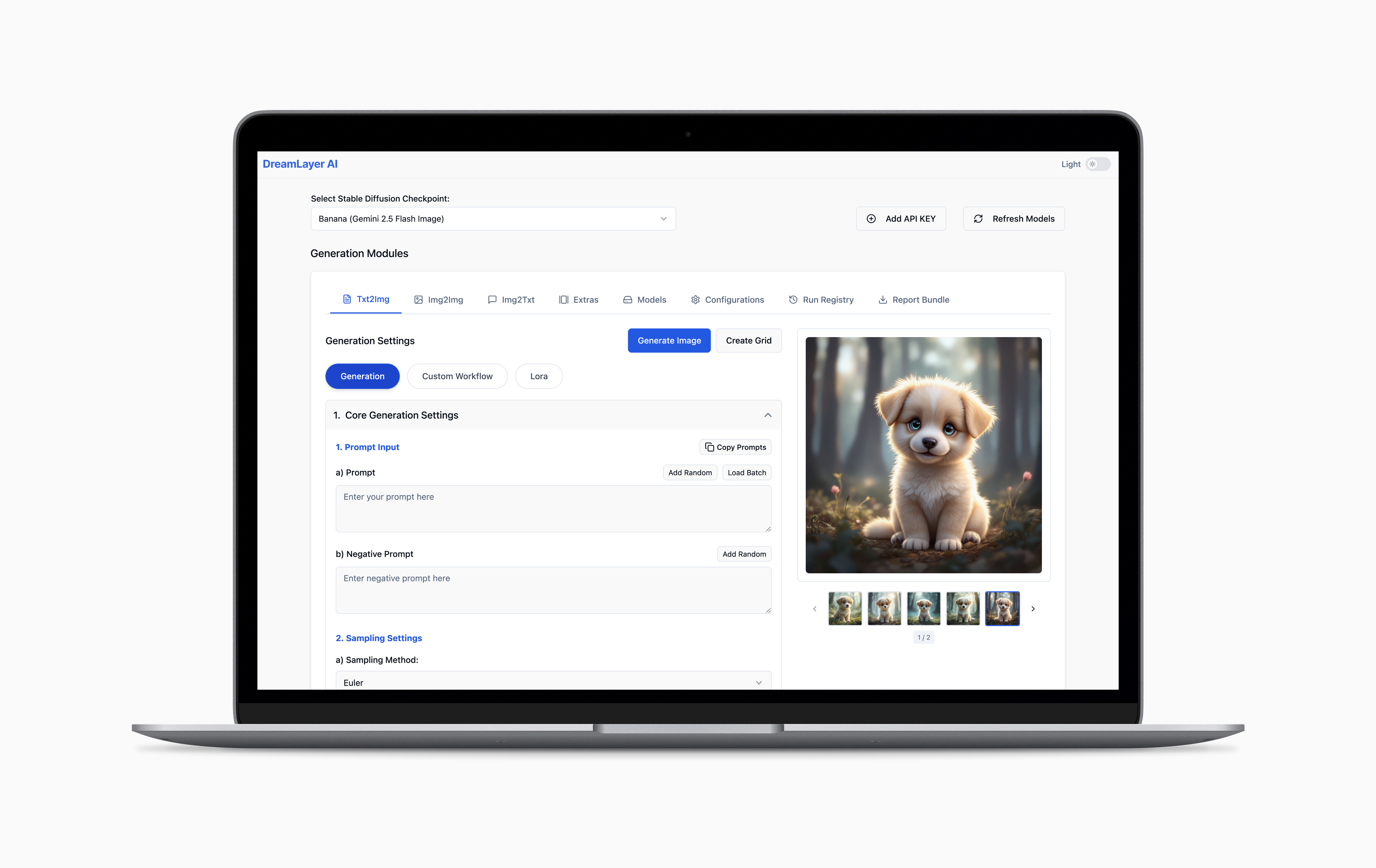 DreamLayer automates reproducible diffusion benchmarking by standardizing prompts, seeds, configurations, and metric evaluation across models. It replaces one-off Jupyter notebook experiments with a consistent, end-to-end evaluation pipeline.